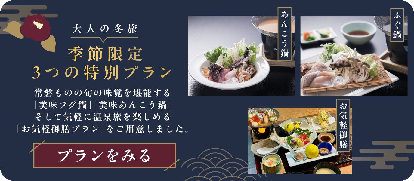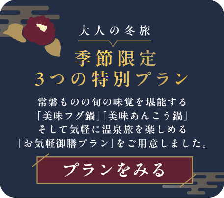 ご夕食は全室お部屋食。ご家族や大切な方との時間を、誰にも邪魔されることなく、ごゆっくりとお過ごしいただけます。冬季限定の常磐ものフグ鍋やあんこう鍋など、季節ごとの特別プランもご用意しております。